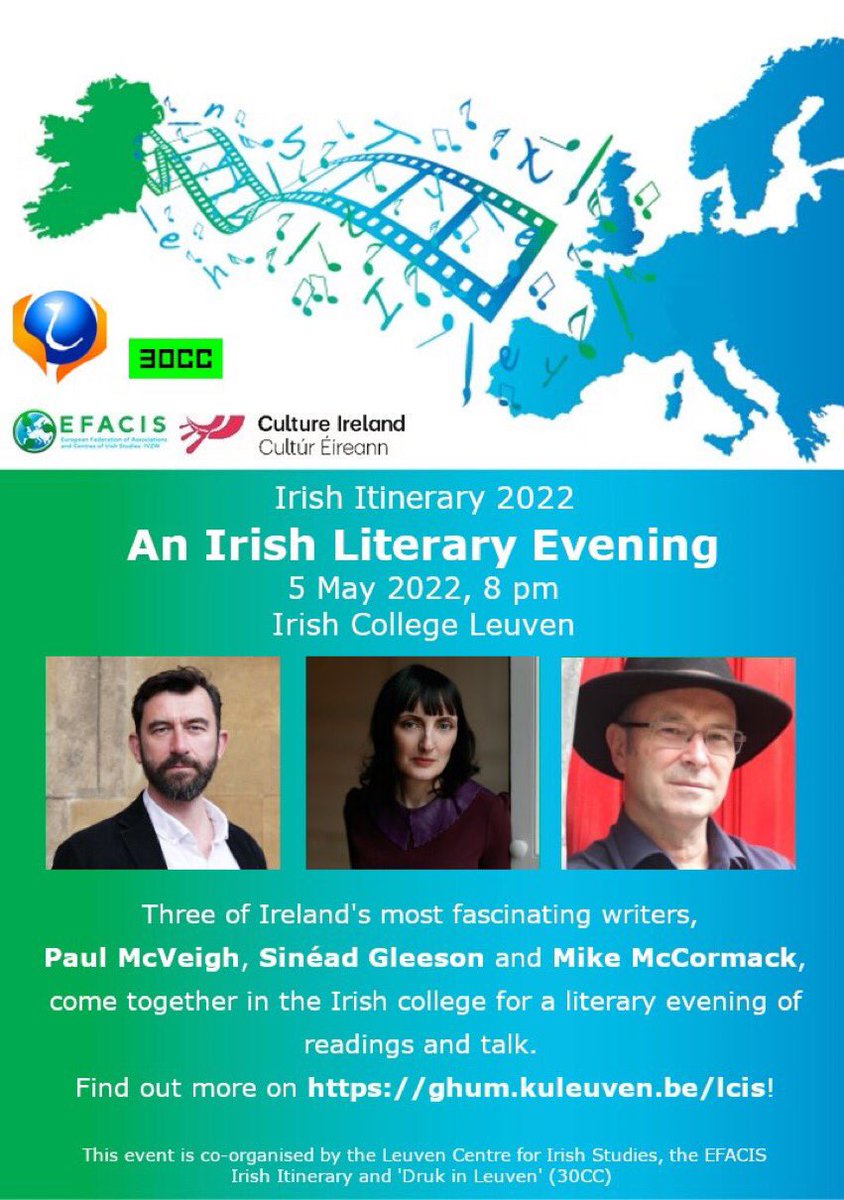 The evening is a co-organised by the Leuven Centre for Irish Studies, the EFACIS Irish Itinerary programme and ‘Druk in Leuven’ (30CC). The event is free for KU Leuven students and personnel, but please register through this link.