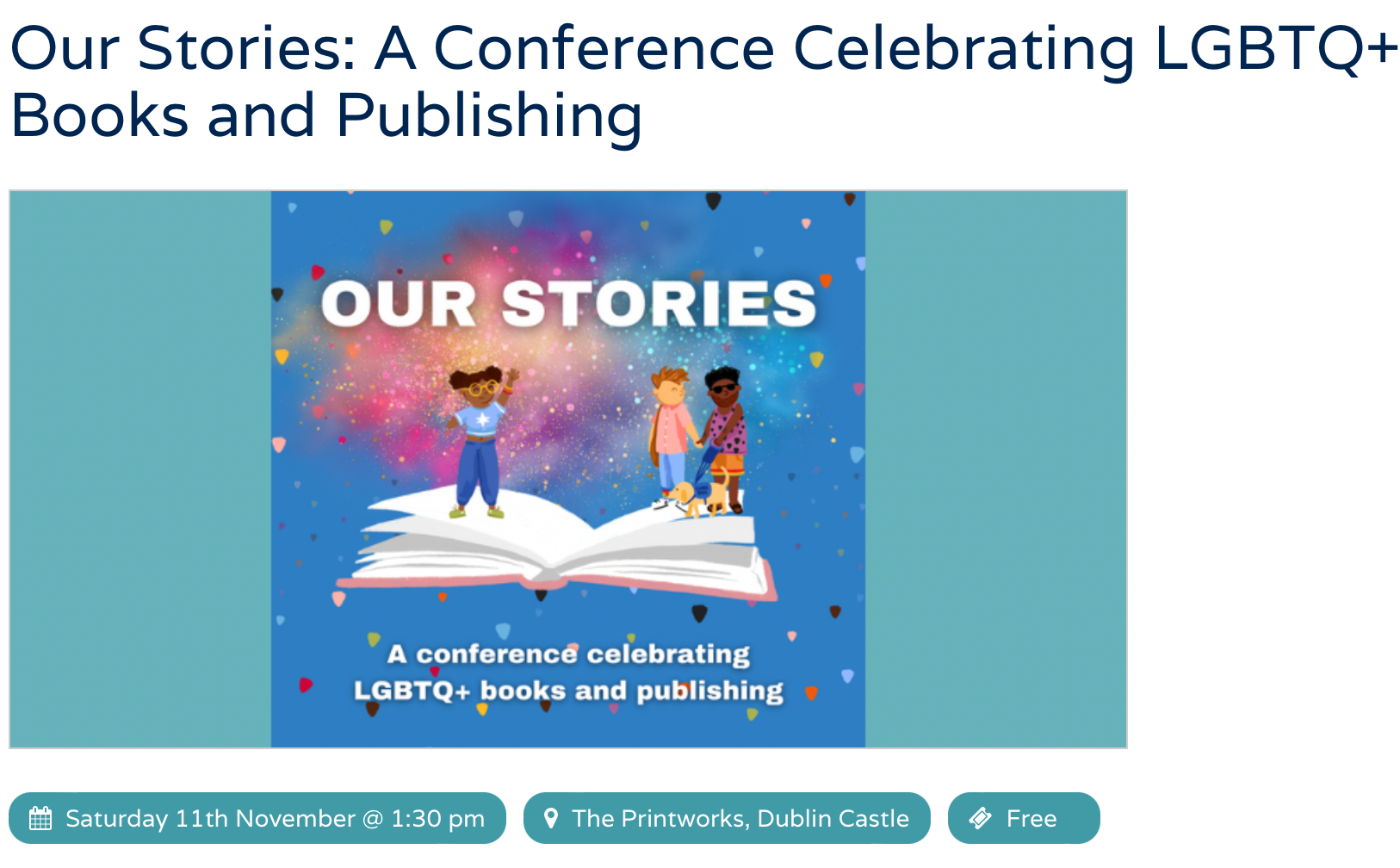 Our stories is the first in person & online conference of 3 conferences in UNESCO Cities of Literature starting in Dublin on Saturday 11 November as part of Dublin Book Festival. Inspired by Pop Up projects (a literary agency in the UK), the conference is aimed at young people (16+) who will hear from established writers and illustrators as well as publishers and agents on representing more Lgbtq+ voices in literature for younger age groups. Award winning authors, Meg Grehan, Adiba Jairgirdar, Jarlath Gregory and Helen Corcoran will be on hand to discuss their creative paths to getting published. Mentors and young participants from the Rainbow Library creative writing & art projects held in Northern Ireland and Cork in 2022 will have an opportunity to discuss their own experience of developing stories and illustrations for publication. Finally, Faerie Press CIC based in Northern Ireland will also launch a new community publishing enterprise during the conference with the aim of publishing inclusive children’s books across the island of Ireland.