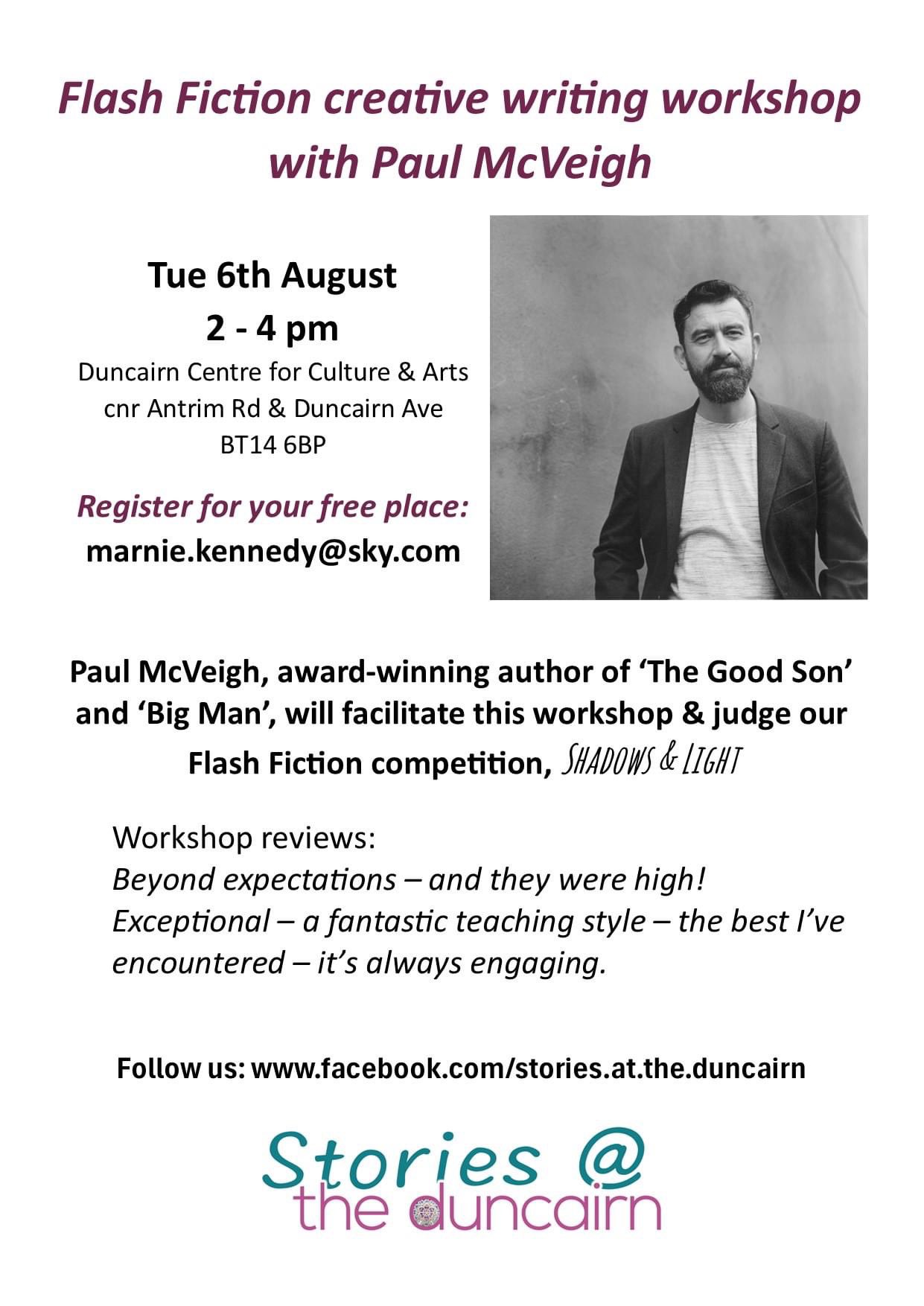 Free Flash Fiction W/Shop July 19, 2024 / Paul McVeigh Writer Thanks to Stories at the Duncairn there’s a free flash fiction workshop with me, August 6th. 20 places. Be quick! Share this: Click to share on X (Opens in new window) X Click to share on Facebook (Opens in new window) Facebook Click to share on LinkedIn (Opens in new window) LinkedIn Click to share on Tumblr (Opens in new window) Tumblr Like Loading... Related