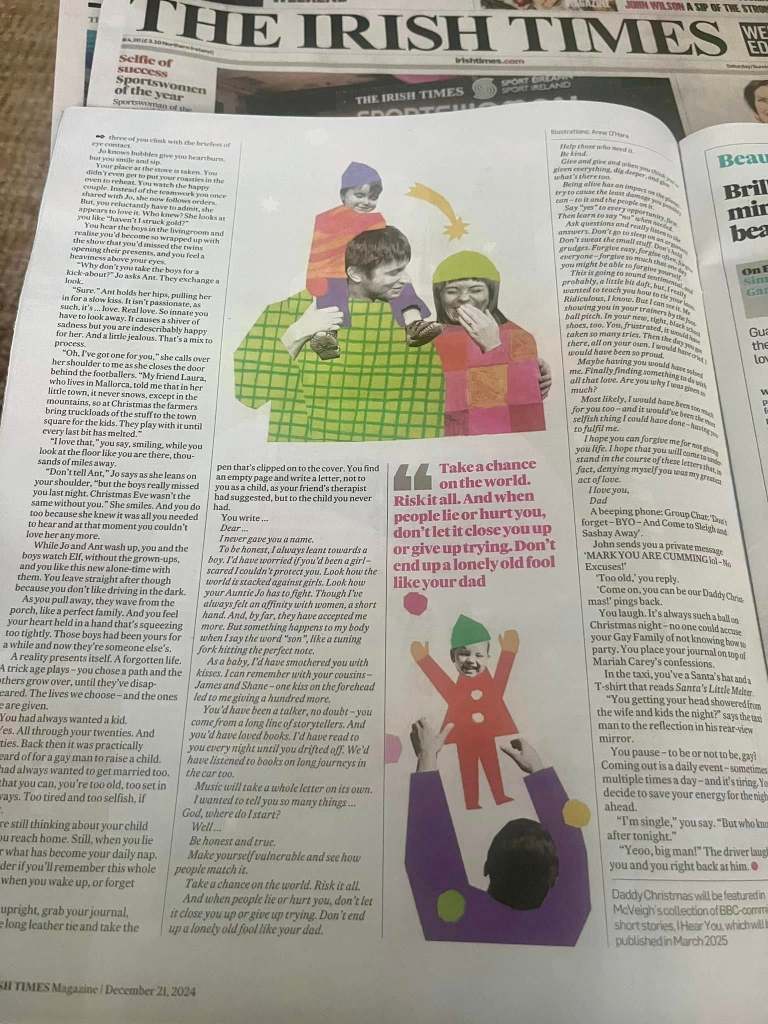 Wow! The Irish Times has done an amazing job with ‘Daddy Christmas’ my Christmas Day short story commissioned by Michael Shannon for BBC Radio Ulster which aired nationally in BBC Radio 4. This is its first time in print thanks to Martin Doyle and Nadine O’Regan at The Irish Times and look at these beautiful illustrations/artworks by Anne O’Hara.