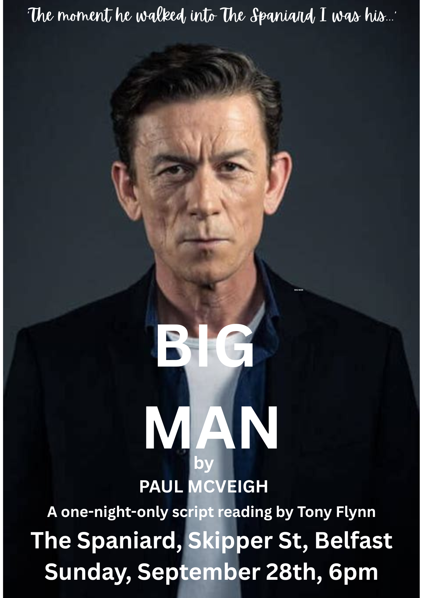 “Come join us for a special evening at The Spaniard! A one-night-only script reading of Paul McVeigh’s play Big Man read by Tony Flynn in the intimate settying to only 30 lucky ticket holders. It’s a unique opportunity to experience the magic of live performance in a cozy and funky setting where the play BIG MAN opens. Don’t miss out on this unforgettable event!