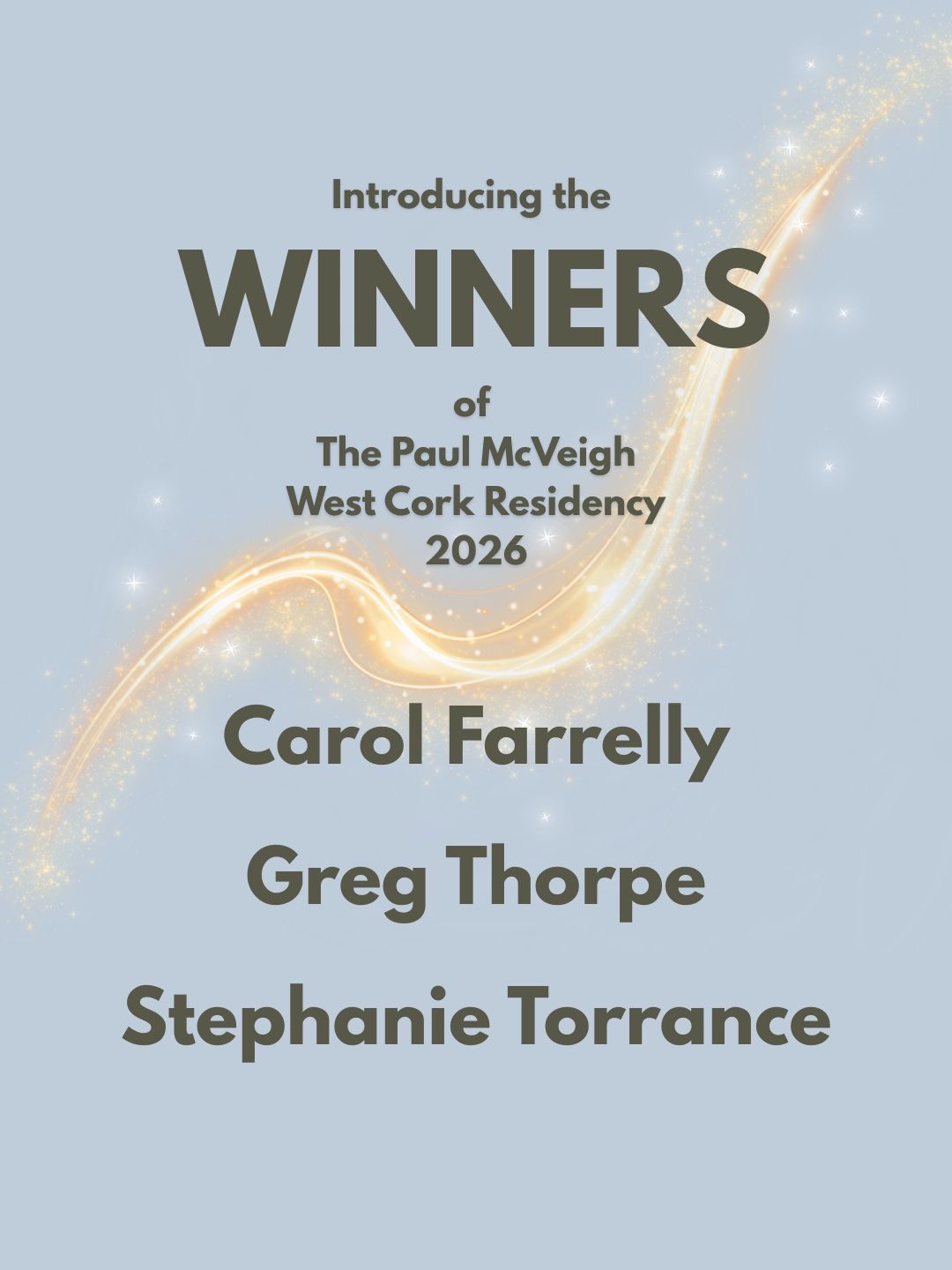 The winners of the Paul McVeigh West Cork Residency are Carol Farrelly, Greg Thorpe and @tephanie Torrance. Thank you to the judges Cathy Galvin and Hilary White who had an extremely difficult job.