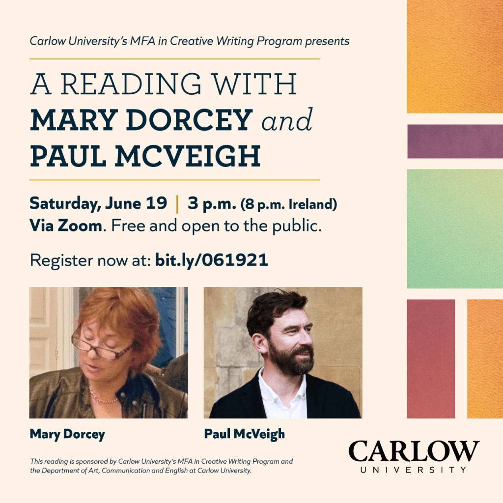 This Saturday coming, June 19th, I’m doing my first event in the USA for Carlow University (sadly online) with Mary Dorcey again. This time however I’m a guest writer and will be reading from my work.