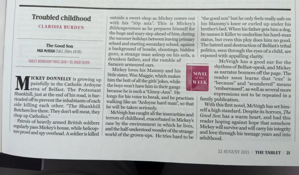 ‘The hatred and destruction of Belfast’s tribal politics, seen through the eyes of a child, exposed with appalling clarity. With this first novel McVeigh has set himself a high standard. Despite its horrors, The Good Son has a warm heart and had this reader hoping against hope..” The Tablet